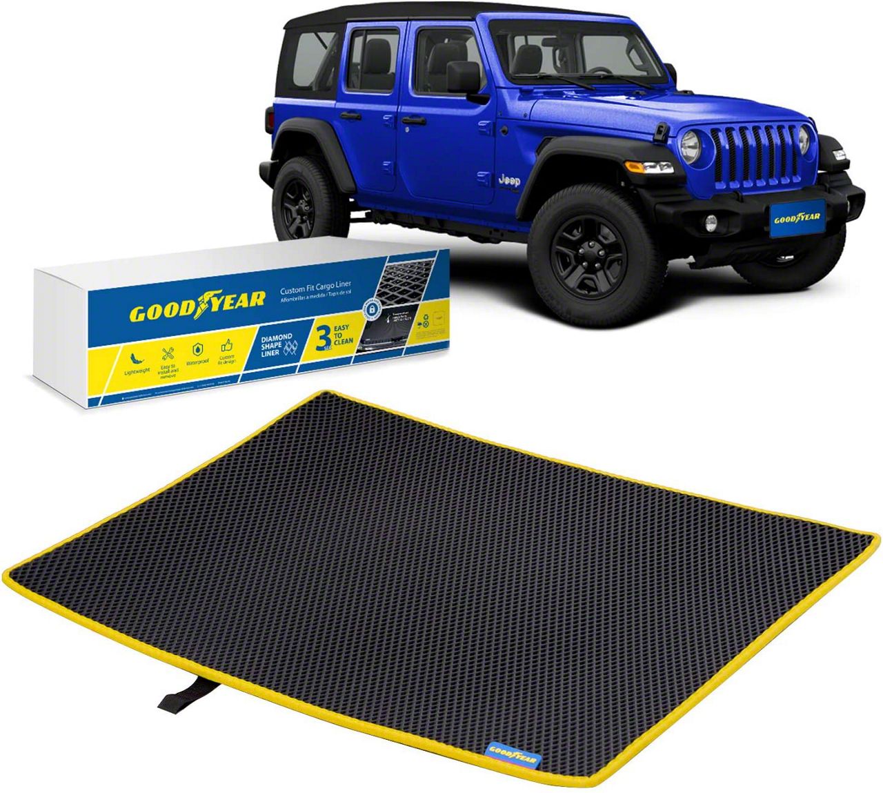 Application. This Goodyear Custom Fit Cargo Liner in Black/Yellow fits all 2018 to 2023 Jeep Wrangler JL 4-Door models.