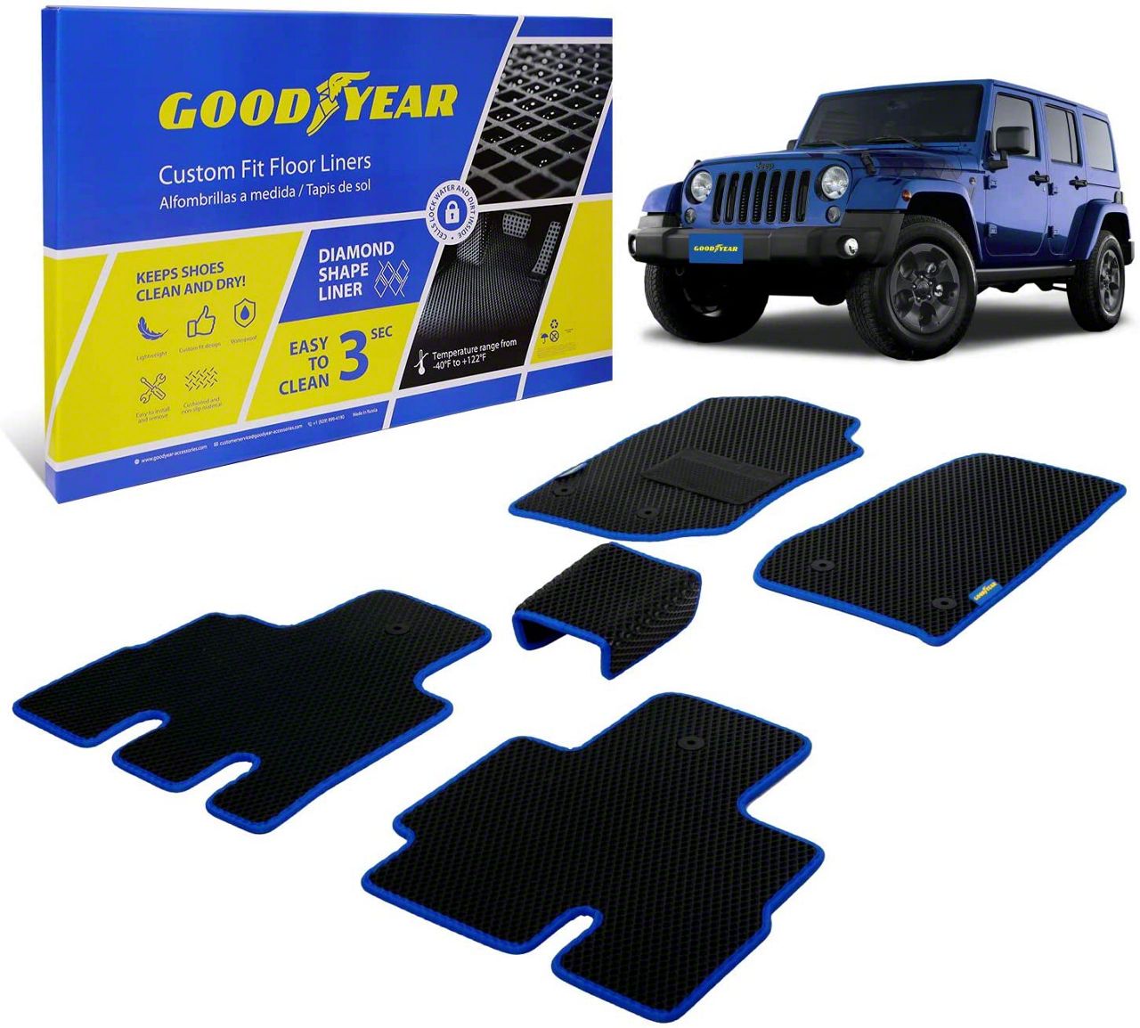 Application. These Goodyear Custom Fit Front and Rear Floor Liners; Black/Blue fits all 2014-2018 Jeep Wrangler JK 4 Door models.