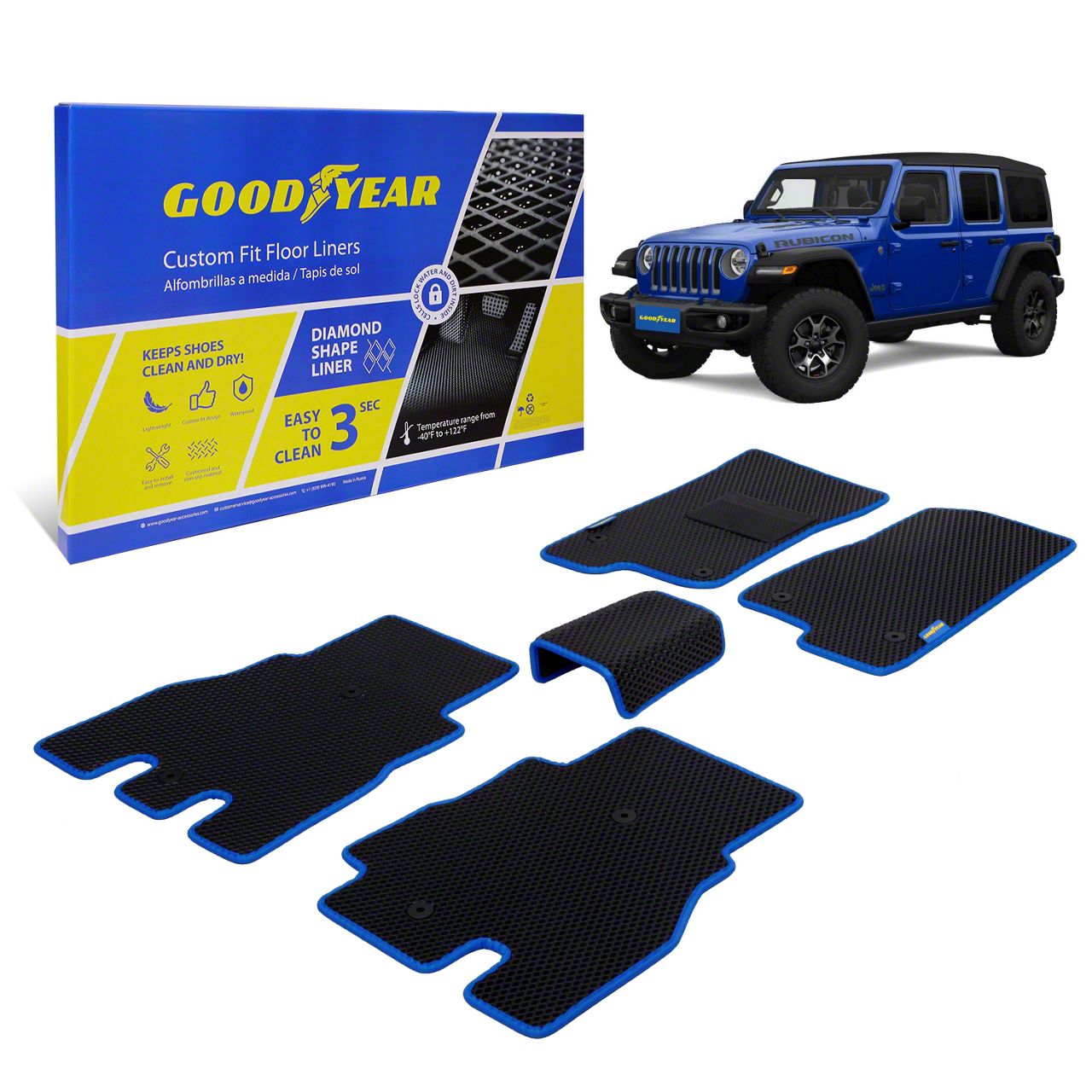 Application. This set of Goodyear Custom Fit Front and Rear Floor Liners in Black/Blue is intended for use on all 2018 to 2022 Jeep Wrangler JL 4-Door models.