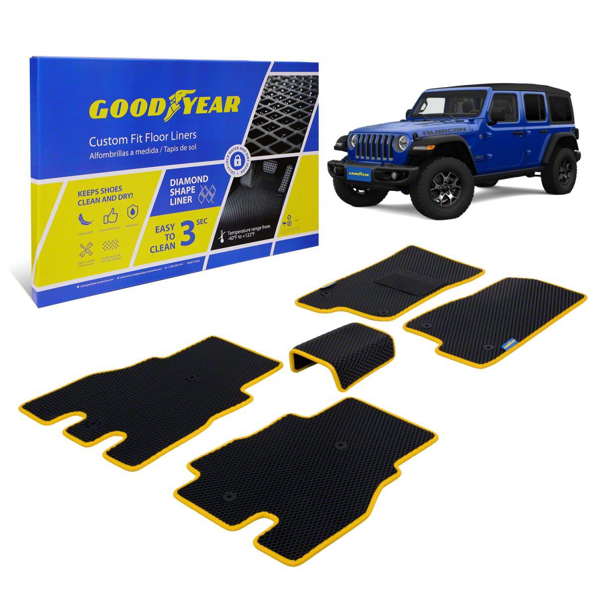Application. These Goodyear Custom Fit Front and Rear Floor Liners; Black/Yellow fits all 2018-2023 Jeep Wrangler JL 4 Door models.