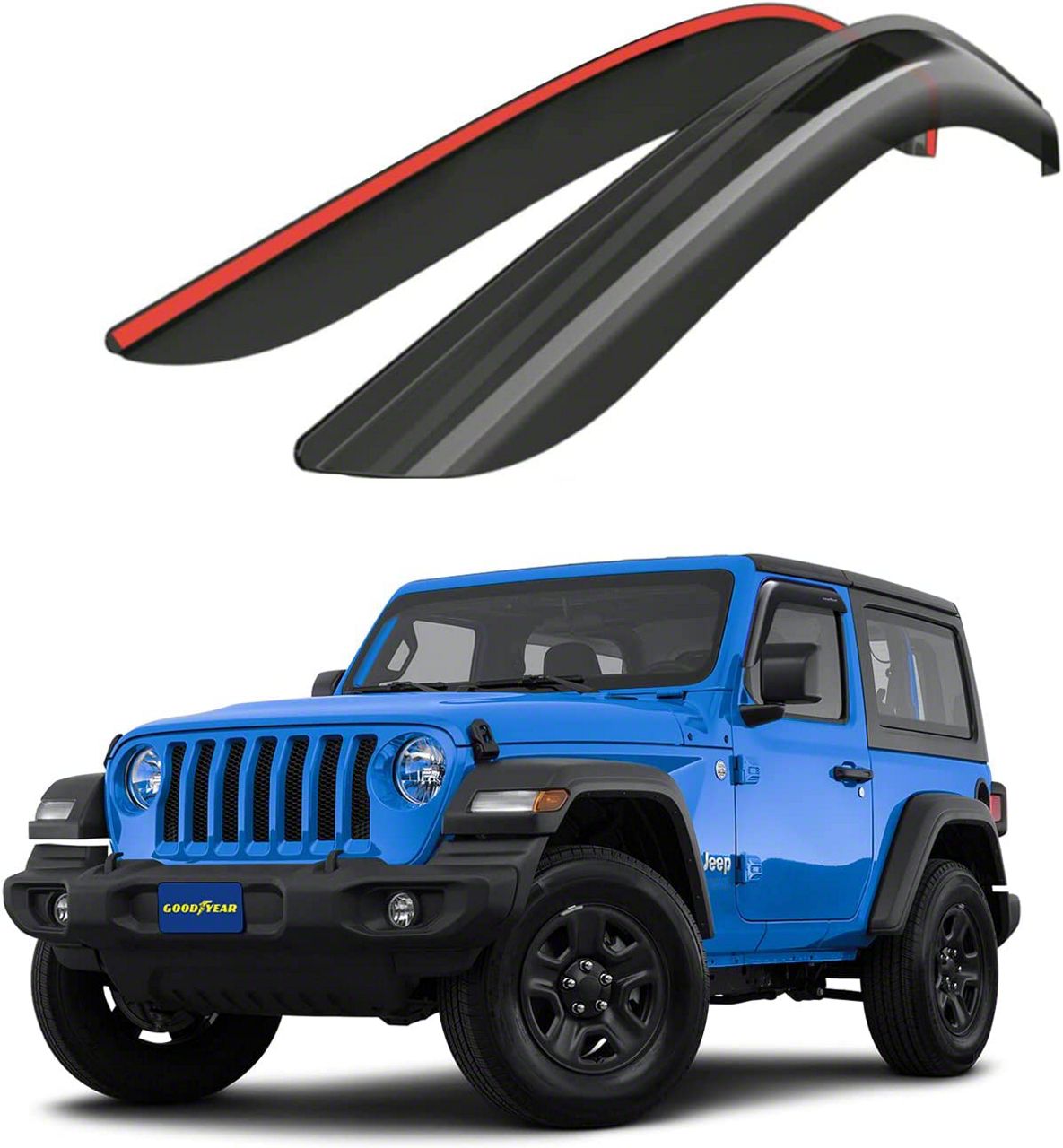 Application. The Goodyear Car Accessories Shatterproof Tape-On Window Deflectors fits 2018-2026 Jeep Wrangler JL 2-Door models.