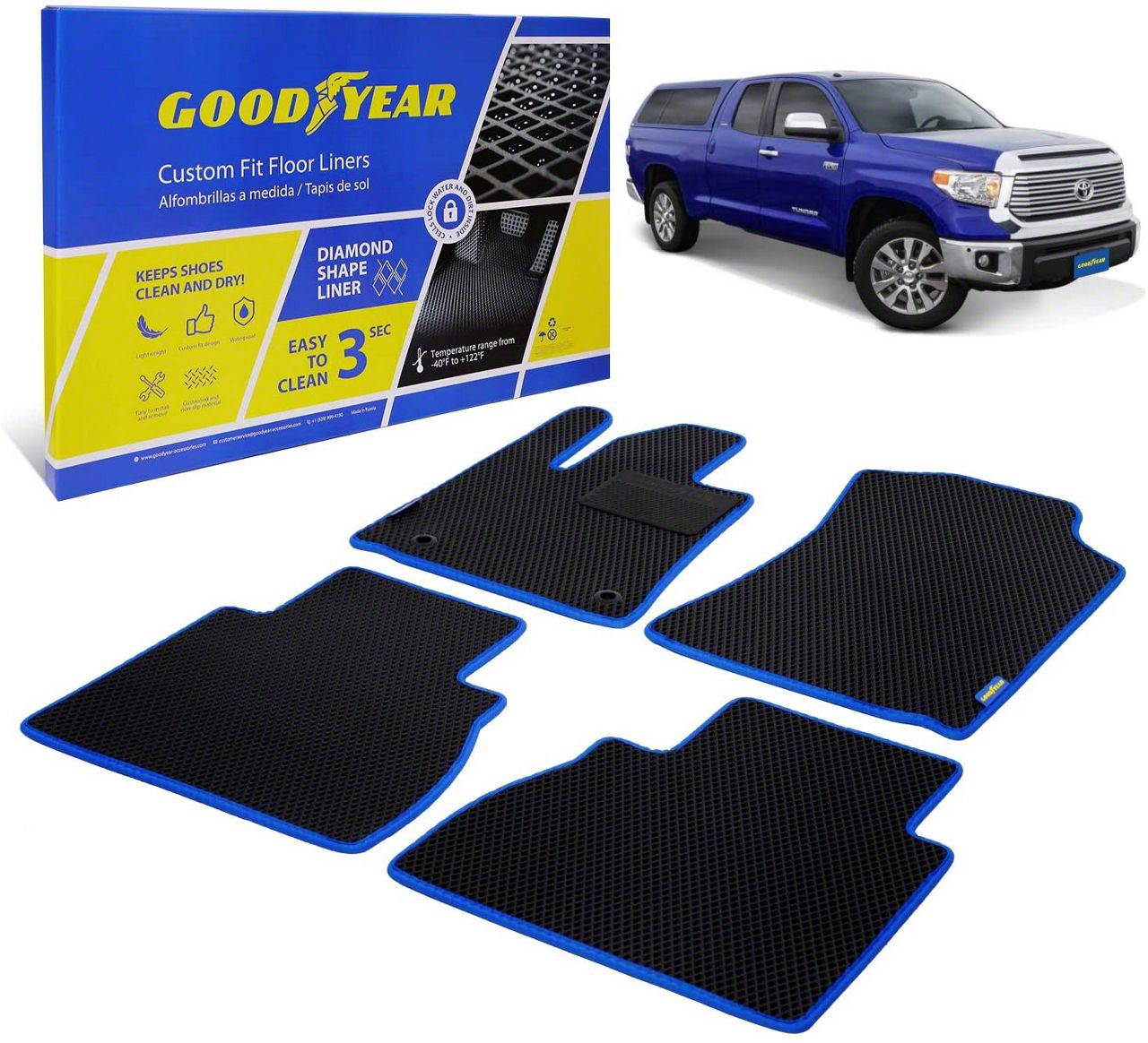 Next-Gen Floor Liners. These Goodyear Custom Fit Front and Rear Floor Liners in Black and Blue ensure the pristine condition of your truck’s interior. Basically, they provide complete and reliable protection to your truck’s flooring against dirt, mud, liquid spills, and other elements.