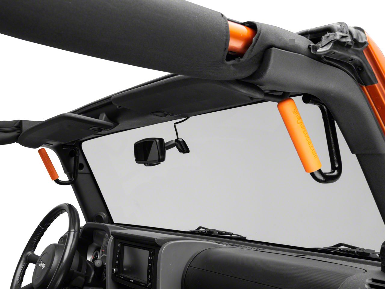 Application. The GraBars Front Grab Handles with Orange Grips fits 2007-2018 Jeep Wrangler JK models.