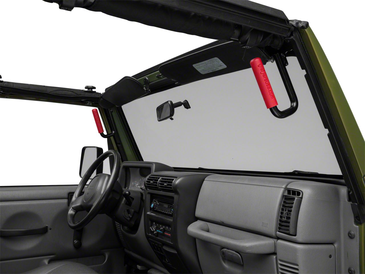 Grabars Front Grab Handles. GraBars Front Grab Handles w/ Red Grips for your 1997-2006 Wrangler TJ allow for effortless entry and exit plus stability when riding in rough and rocky terrain. Military spec and top-class welding techniques make Grabar the perfect alternative to slippery steering wheels or seat tops. They are proudly made in the U.S.A.