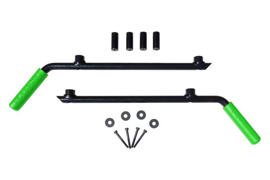 Superior Construction. For maximum strength and durability, these front grab handles are constructed using genuine solid steel. The bars are applied with a rust-resistant black coating to protect against corrosive elements. Furthermore, the handles come with green grips to add a pop of color to your vehicle’s interior.