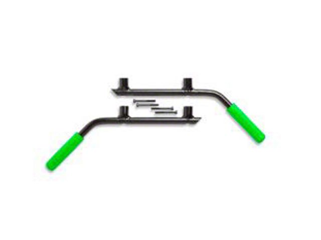 Hold Fast! Improve your Jeeps interior with the GraBars Rear Grab Handles w/ Green Grips. A true reliable and smart upgrade for your vehicle. These handles provide extra assistance for entry and exit into your raised cab, and that added stabilization during those extremely rough terrain drives. No more fear of falling out or slipping; with these rear grip interior handles, a little bit goes a long way.