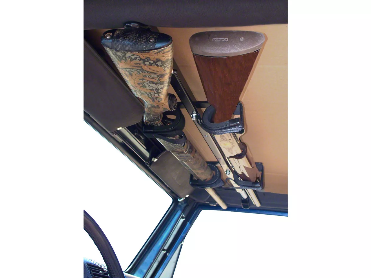 Function. This Redrock 4x4 Quick-Draw Overhead Gun Rack lets you carry two full-size guns with or without scopes in your vehicle. Its soft, foam-lined gun clips and Velcro straps hold your guns safely in place.
