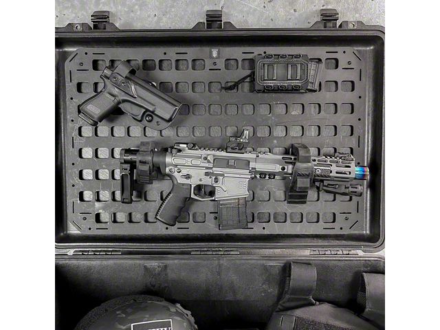 Application. This Grey Man Tactical RMP Case Lid Organizer Rifle Rack and Holster Integration MOLLE Panel Package with 3M Dual Lock Fastener Kit (21.25-Inch x 17-Inch) fits universally and requires minimal adjustments.