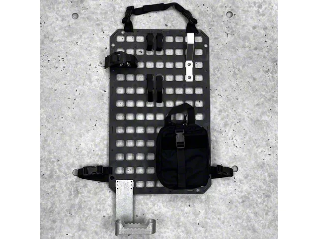 Construction and Appearance. This MOLLE panel package features a matte black finish, providing a sleek and professional look. The set includes an RMP, headrest strap, seat bottom strap, buttstock cup kit, buttstock extension, QuickFist Go-Between clamp, RMP hook, utility pouch, and two hook and loop cinch straps, ensuring all your gear is securely stored and easily accessible.