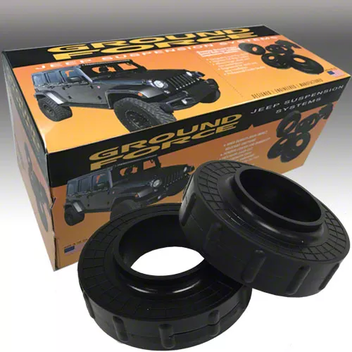 Removes Factory Rake. The Ground Force Front Leveling Kit will raise the front of your Wrangler by 1.25 inches to eliminate the factory rake, leveling out your Jeep for a more aggressive off-road look. This Kit will maintain the OEM ride quality of your Wrangler, while allowing you to run larger diameter wheels and tires with no other modifications necessary.