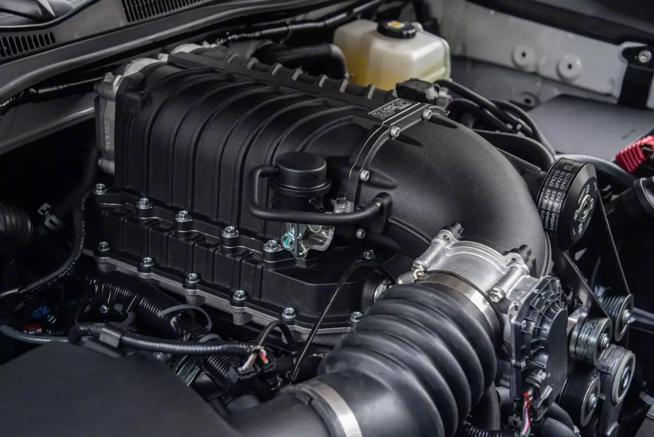 Construction and Appearance. Finished in matte black, the supercharger features Eaton’s TVS1900 rotating group with a 170-degree lobe helix angle for optimal flow and durability. The included intercooler core uses high-density fins and extruded tubes to enhance heat exchange under load. Harrop has designed this system to retain stock ancillaries including the A/C, engine fan, and power steering while remaining compatible with both stock and aftermarket airboxes.