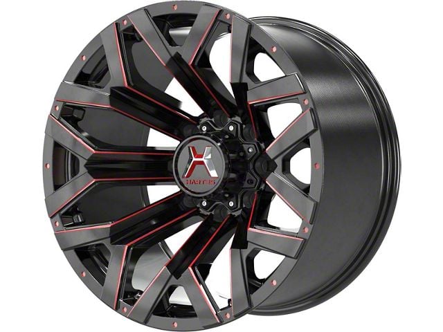 Hartes Metal Hawkish Gloss Black Milled with Red Tint Wheel; 20x10The Hartes Metal Hawkish Gloss Black Milled with Red Tint Wheel offers a sleek and sophisticated look, elevating the vehicle’s presence with its distinct design. Crafted with precision, it complements the Hartes Metal aesthetic, adding a touch of elegance to the vehicle’s overall appearance.