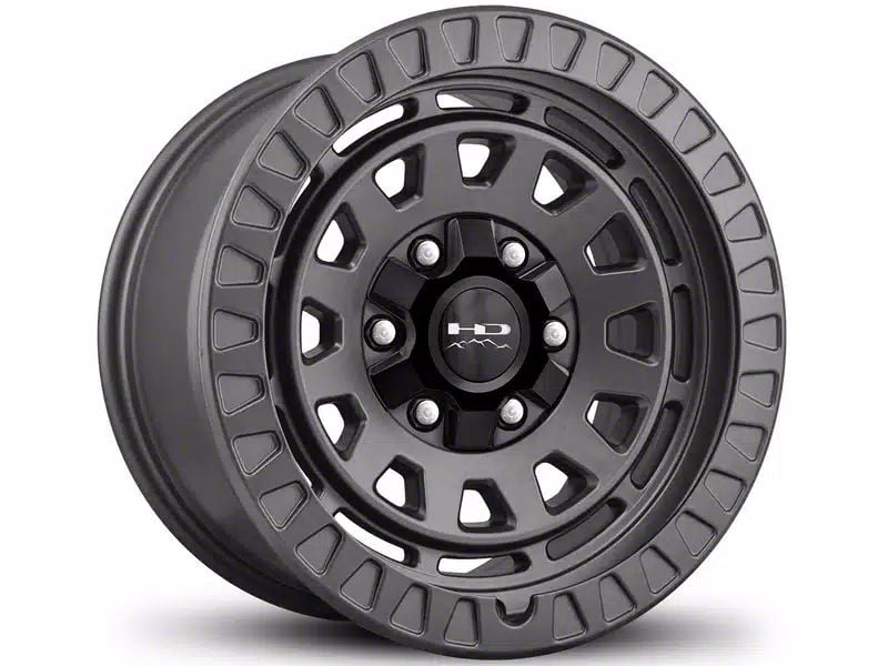 HD Off-Road Wheels Venture Satin Dark Gray Wheel; 17x9 presents a striking balance of style and sophistication. The design of this wheel accentuates the vehicle's appearance, complementing its distinctive character. Its construction reflects the premium quality expected from HD Off-Road Wheels.
