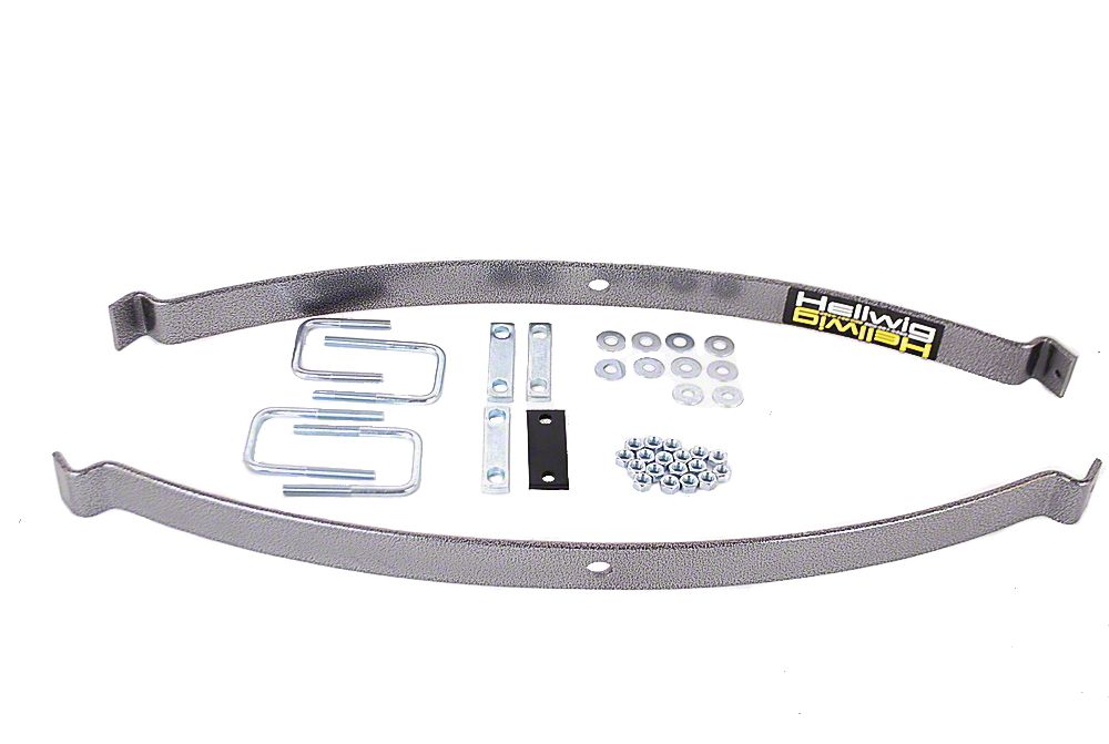 Alloy Spring Steel Construction. The Hellwig EZ-990 Helper Spring Kit enhances your vehicle's performance and safety by providing a more leveled and stable ride. Made with high-quality alloy spring steel and featuring a sleek black spring finish, the hot-formed and heat-treated construction ensures durability and reliability. The kit is designed to accommodate a maximum safe load of 2,000 pounds, making it perfect for heavy-duty applications.