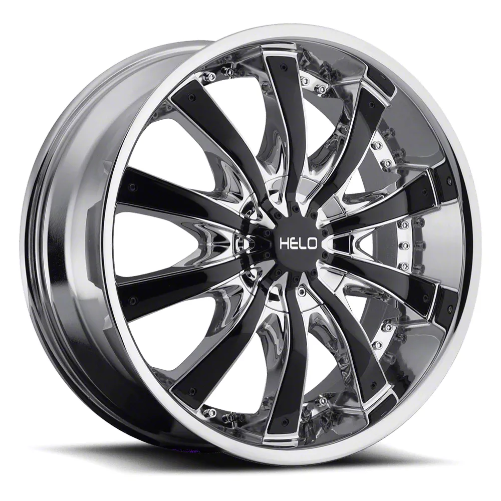 HELO HE875 Chrome with Gloss Black Accents Wheel; 28x10 The HELO HE875 Chrome with Gloss Black Accents Wheel combines a sleek, sophisticated design with premium construction that enhances the visual appeal and complements a wide range of vehicle styles. This wheel is perfect for those seeking to make a bold statement while maintaining elegance and robustness.