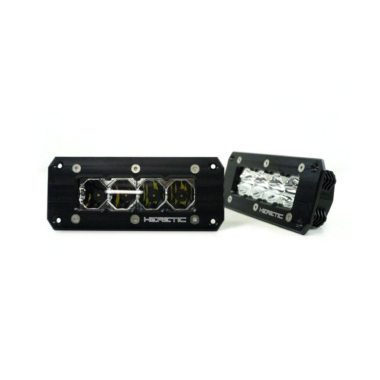 Multi-Use. Made for a universal fit, this Heretic Studios Flush Mount LED Pod Light comes in a matte black finish housing with a clear lens. Built in the USA, this pod light is four inches long and crafted from CNC machined aircraft grade aluminum. This pod light has multiple uses and works as a chase light, ditch light, A-pillar light, and other requirements.