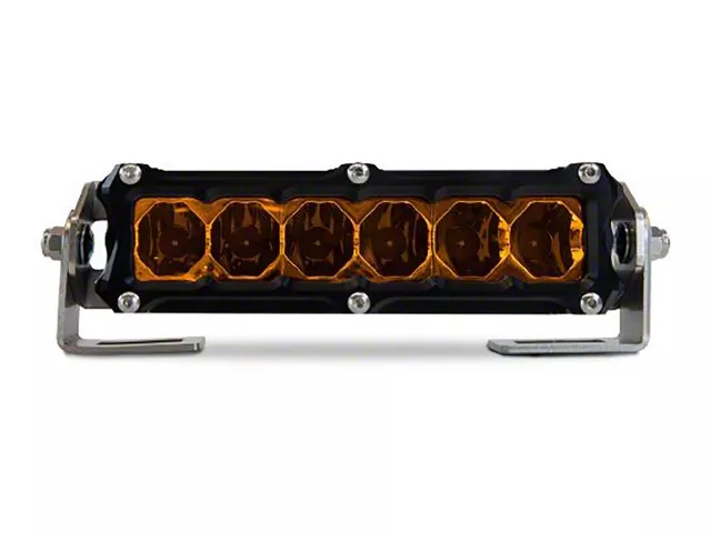 Description. The Heretic 6" Amber LED light bar is built for off-road. This high performance LED light bar is designed and manufactured in the USA, housed in CNC machined aircraft-grade aluminum, and outfitted with best-in-class circuit boards that allow temperature control and long-lasting light. The 6” Amber LED light bar is recommended as a front bumper light bar, specifically optimized for dusty, foggy, and low visibility conditions.