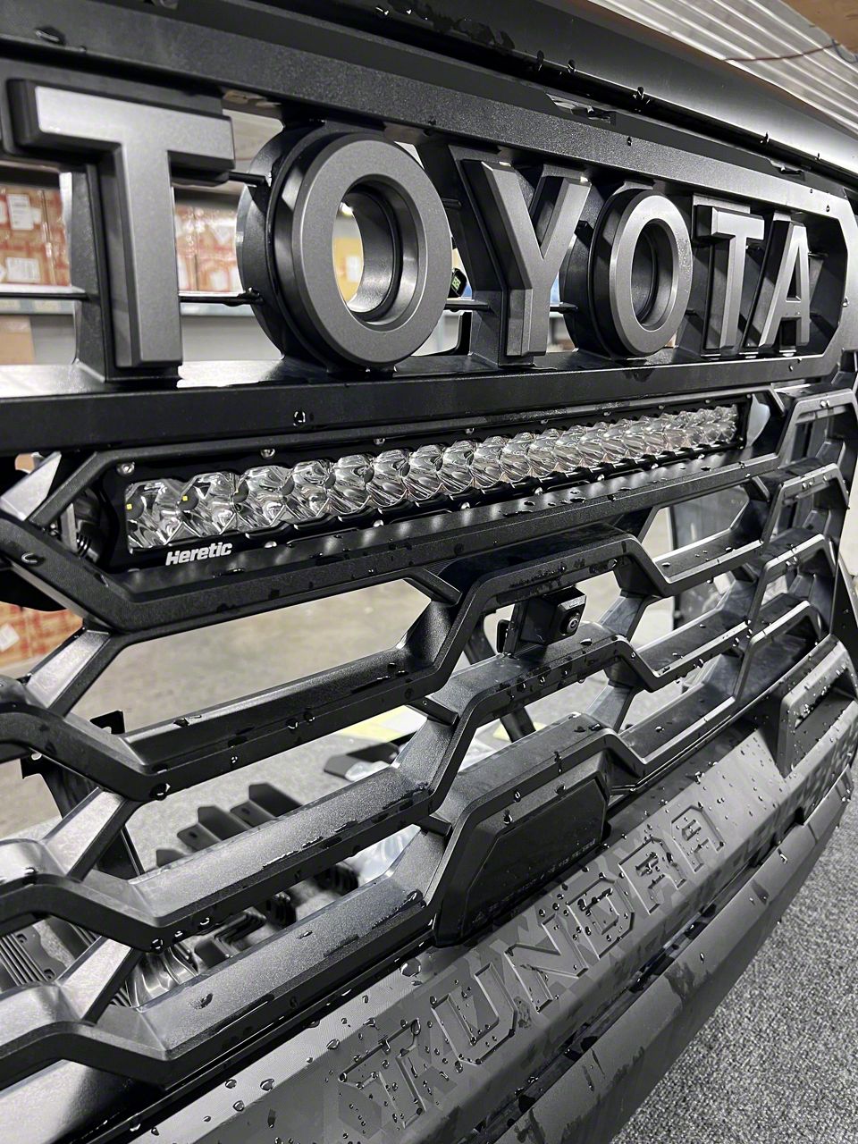 Application. This Heretic Studios 20-Inch LED Light Bar with TRD Pro Behind the Grille Mounting Brackets (Spot Beam and Clear Lens) fits all 2022-2026 Toyota Tundras.