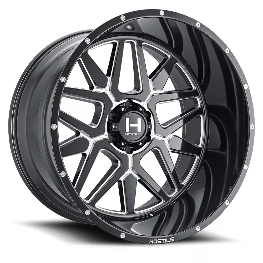 The 20x12 Hostile Diablo Blade Cut 5-Lug Wheel is completed in a high-quality gloss black finish with steel milled accents for an aggressive appearance. For added protection and good looks, there is a durable clear coat that withstands the rigors of everyday driving.