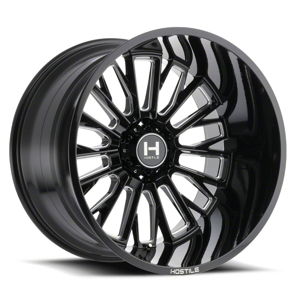The 22x14 Hostile Fury Blade Cut 6-Lug Wheel is completed in a high-quality gloss black finish with steel milled accents for an aggressive appearance. For added protection and good looks, there is a durable clear coat that withstands the rigors of everyday driving.