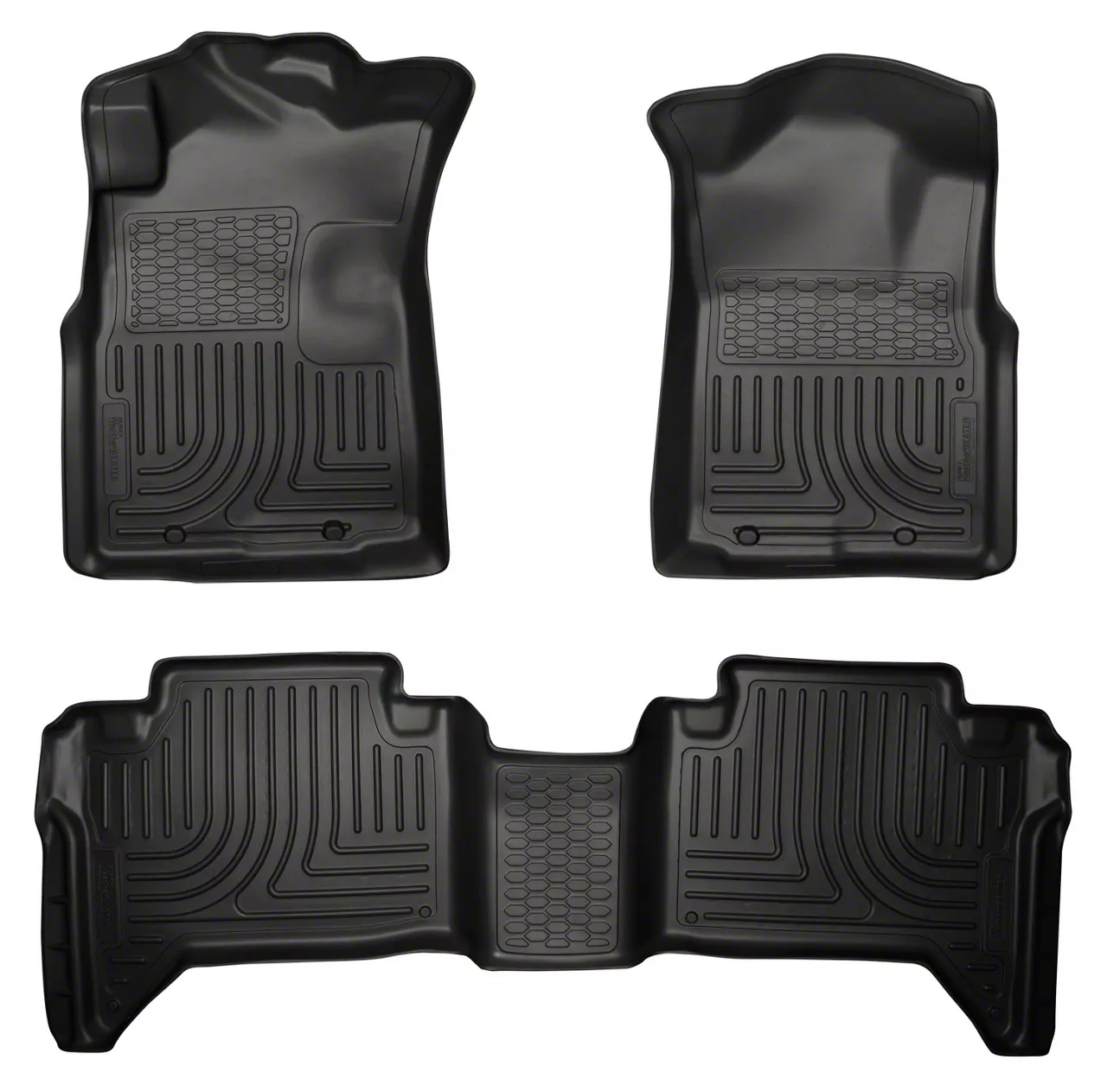 Application. These black Husky WeatherBeater Front And 2nd Seat Floor Liners with Footwell Coverage will fit all 2005-2015 Toyota Tacoma Double Cab models.