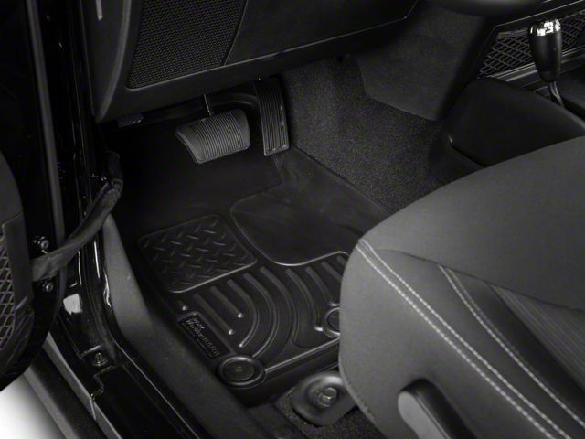 Rugged Construction. These black Wrangler floor liners are made here in the USA from a durable patented rubberized material to ensure the toughest protection for your carpets. Equipped with underside cleats and accommodations for your JK's attachment pins, these liners boast a perfect, shift free fit. This pair of liners is backed by Husky's lifetime guarantee, which ensures these liners will not crack or break from use during your lifetime.