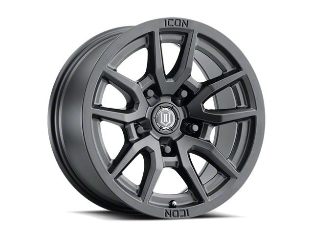 ICON Alloys Vector 5 Satin Black 5-Lug Wheel; 17x8.5; 25mm Offset exudes a sleek aesthetic appeal, complementing a range of vehicle styles. Its dark stainless finish emanates sophistication, while the brand reputation of ICON Alloys ensures robustness. This wheel seamlessly merges elegance with durability.