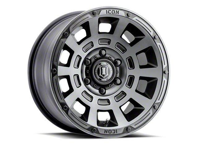 ICON Alloys Thrust Smoked Satin Black 6-Lug Wheel; 17x8.5; 0mm Offset - Enhance your vehicle's style with the ICON Alloys wheel. This wheel's distinctive design and finish complement your vehicle's aesthetics, making a bold statement. It's crafted to accentuate the unique character of your car, emphasizing a premium and robust appeal.