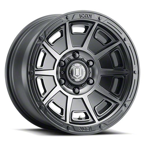 ICON Alloys Victory Smoked Satin Black Wheel; 17x8.5. The ICON Alloys Victory Smoked Satin Black Wheel offers a striking balance of style and refinement. Its unique design accentuates the vehicle's aesthetic, while the premium construction underscores its robust nature. This wheel is a perfect choice for those seeking both elegance and a strong visual statement.