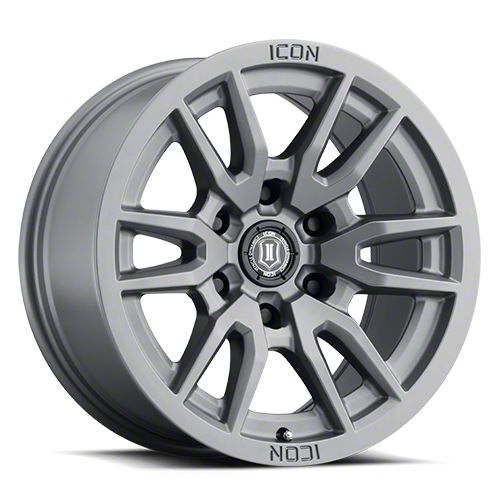 This 17x8.5 ICON Alloys Vector 6 Titanium 6-Lug Wheel is completed in a high-quality titanium gray finish for a striking appearance. There's a durable clear coat to help protect against driving hazards.
