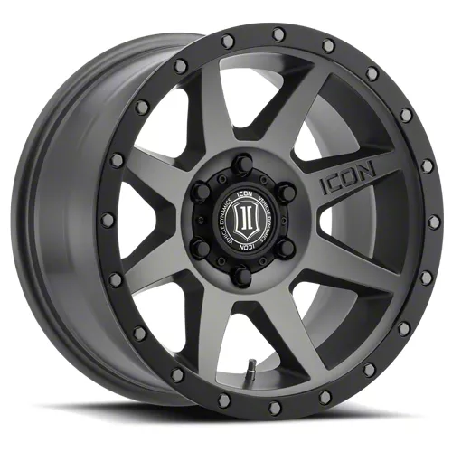 ICON Alloys Rebound Titanium 6-Lug Wheel; 17x8.5; 0mm Offset exudes a sleek aesthetic appeal, complementing a range of vehicle styles. Its dark stainless finish emanates sophistication, while the brand reputation of ICON Alloys ensures robustness. This wheel seamlessly merges elegance with durability.