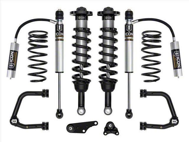 Enhanced Performance Lift System. The ICON Vehicle Dynamics 1.25 to 3-Inch Suspension Lift System with Tubular Upper Control Arms and Triple Rate Rear Springs, Stage 3, elevates both drivability and performance for 4WD Tacoma models. This system provides increased wheel travel, superior damping, and improved ride quality over stock, making it a valuable upgrade for off-road and rugged terrain.