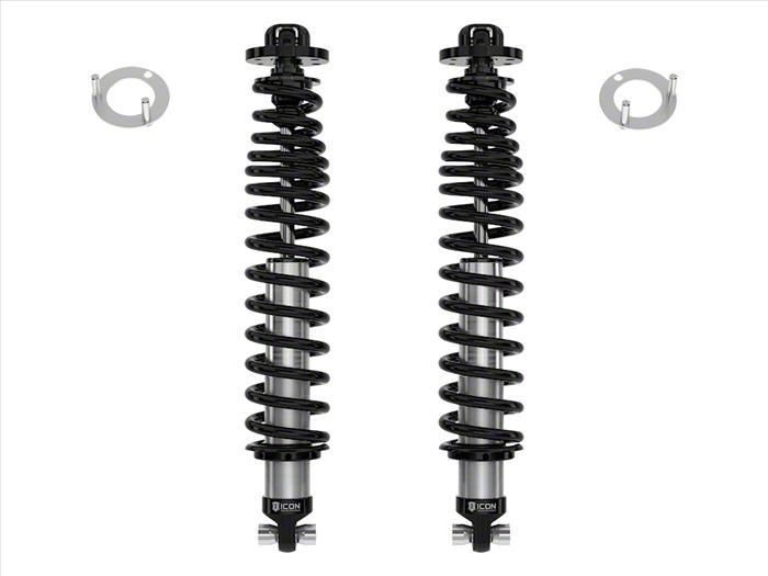Description. ICON Vehicle Dynamics V.S. 2.5 Series internal reservoir rear coilover shocks are an incredible upgrade for the rear end of the 2021-2026 Ford Bronco. These adjustable coilovers allow up to 2-3” of rear lift height adjustability on 4-door Broncos without the Sasquatch package or 1.25-2.25” of rear lift over stock 4-door Sasquatch equipped Broncos, allowing the use of larger, more aggressive wheel and tire combinations. ICON’s Vehicle-specific shock length and valving along with the larger 2.5” shock body and increased piston area over stock components yield the maximum travel possible along with superior ride quality and suspension performance both on- and off-road. These rear coilovers are mounted in a shaft up orientation and feature unique ICON engineered progressive dual rate coil springs that provide extra weight capacity for those who frequently load out their Broncos with extra gear and equipment while maintaining excellent on- and off-road performance characteristics. When paired with ICON 2.5 Series front coilovers vehicle control will be balanced front to rear, resulting in the best overall driving experience for your Ford Bronco.