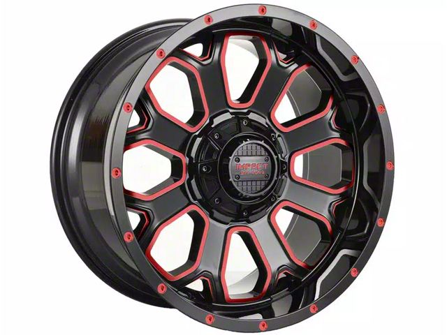 Impact Wheels 818 Gloss Black and Red Milled 6-Lug Wheel; 20x10; -12mm Offset exudes a captivating aesthetic appeal that seamlessly complements various vehicle styles. The craftsmanship of Impact Wheels ensures a robust and premium feel, making it a standout choice for discerning drivers.