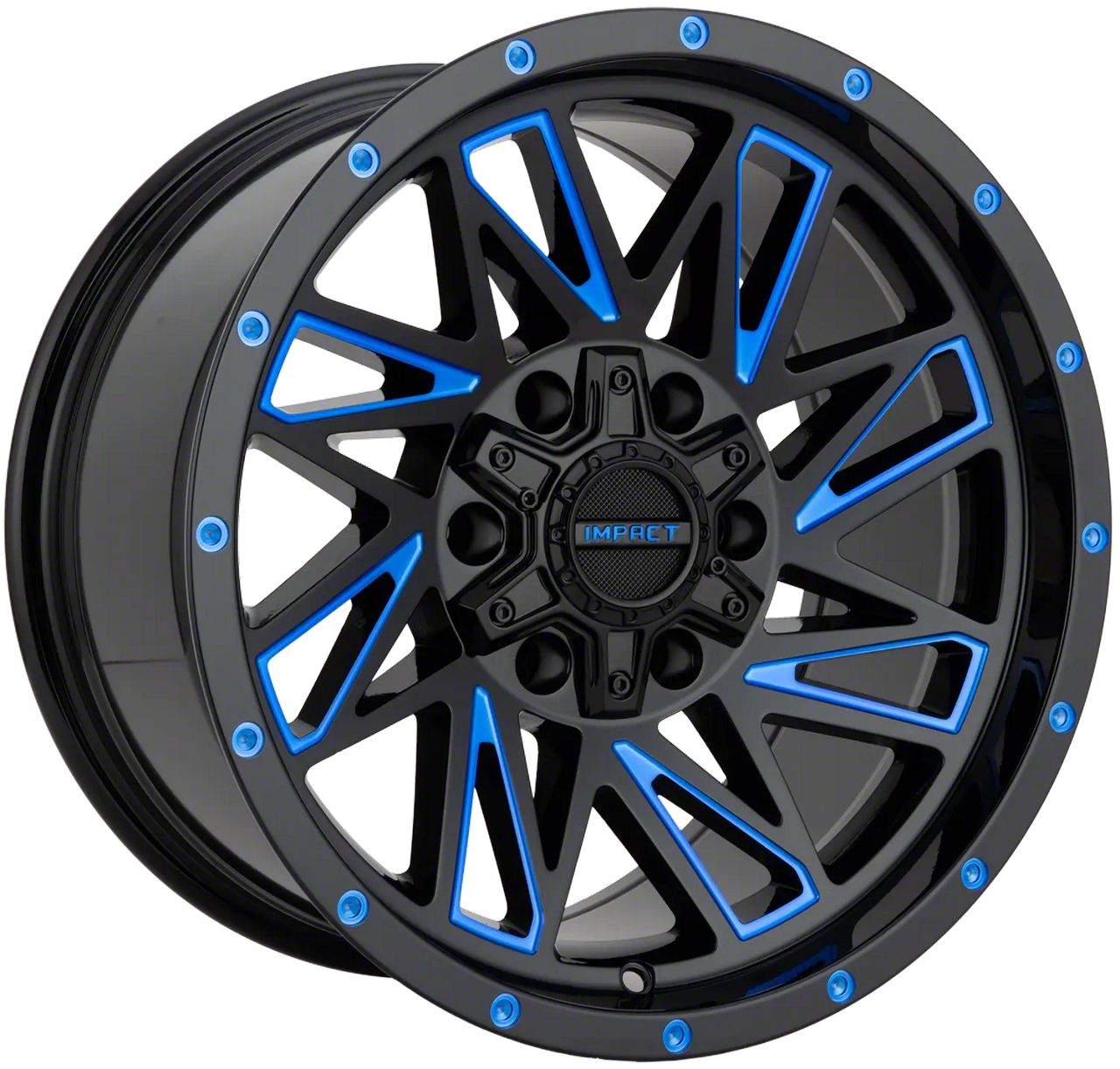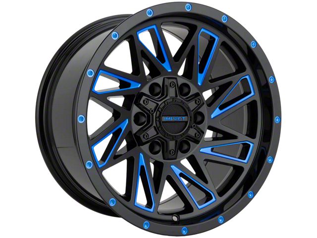 Impact Wheels 814 Gloss Black and Blue Milled 6-Lug Wheel; 17x9; 0mm Offset delivers a bold and modern aesthetic, ideal for enthusiasts seeking a refined yet assertive look for their vehicle. With its standout design and distinct finish, this wheel enhances the vehicle's visual stance and street presence. The precise craftsmanship and premium aluminum build reflect Impact Wheels' dedication to quality and distinctive design. Whether parked or in motion, this wheel draws attention with its clean, aggressive styling.