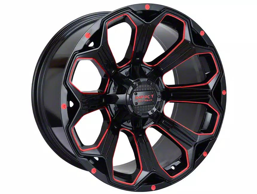 Impact Wheels 817 Gloss Black and Red Milled 6-Lug Wheel; 20x10; -12mm Offset delivers a bold and modern aesthetic, ideal for enthusiasts seeking a refined yet assertive look for their vehicle. With its standout design and distinct finish, this wheel enhances the vehicle's visual stance and street presence. The precise craftsmanship and premium aluminum build reflect Impact Wheels' dedication to quality and distinctive design. Whether parked or in motion, this wheel draws attention with its clean, aggressive styling.