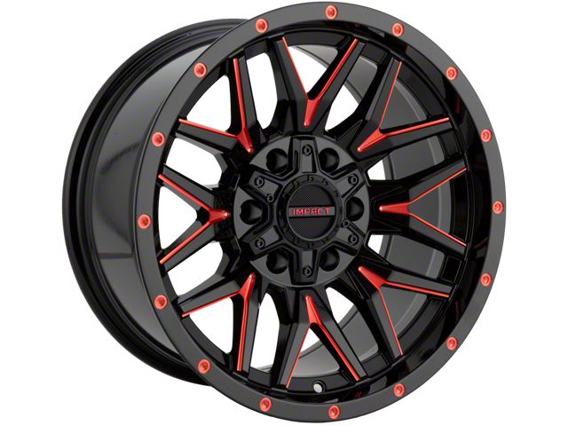 Impact Wheels 819 Gloss Black and Red Milled 6-Lug Wheel; 17x9; 0mm Offset delivers a bold and modern aesthetic, ideal for enthusiasts seeking a refined yet assertive look for their vehicle. With its standout design and distinct finish, this wheel enhances the vehicle's visual stance and street presence. The precise craftsmanship and premium aluminum build reflect Impact Wheels' dedication to quality and distinctive design. Whether parked or in motion, this wheel draws attention with its clean, aggressive styling.