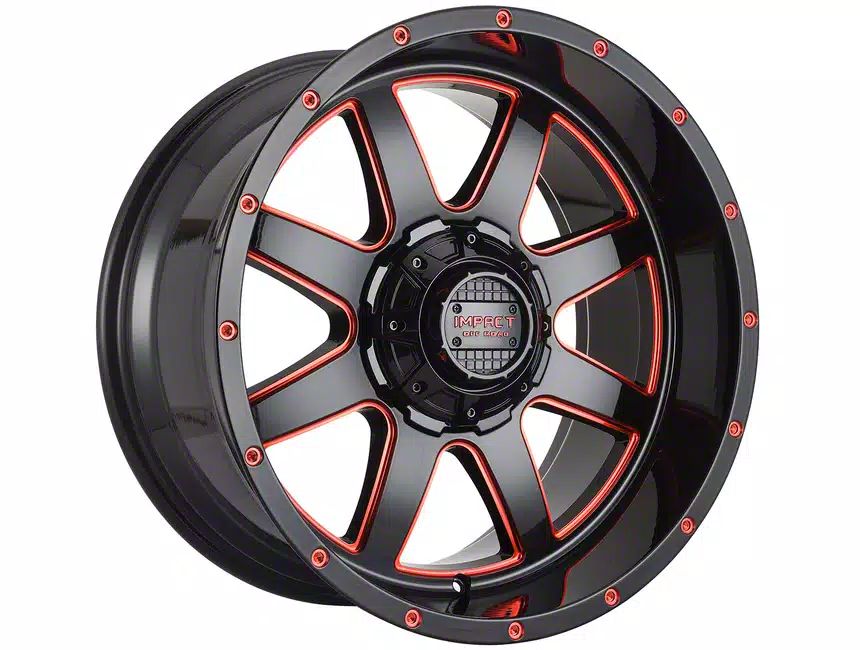 Impact Wheels 804 Gloss Black and Red Milled 6-Lug Wheel; 20x10; -12mm Offset - This wheel's elegant design will certainly enhance your vehicle's aesthetic, complementing its luxury and performance. The unique styling of this wheel makes it an ideal choice for a standout quality of your ride, reflecting the premium quality associated with the Impact Wheels brand.