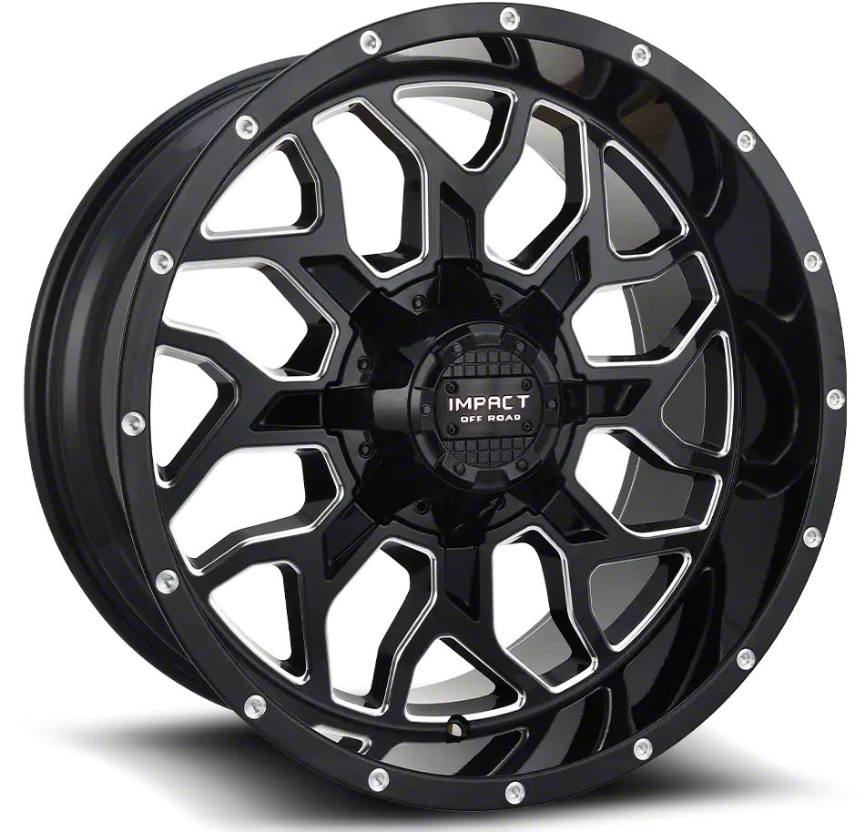 The 20x12 Impact Wheels 813 Gloss Black Milled 6-Lug Wheel; 20x12; -44mm Offset is completed in a high quality, gloss black finish. The milled steel accents are where it really shines through. The accents make the split section of the spokes pop along the faux beadlock.