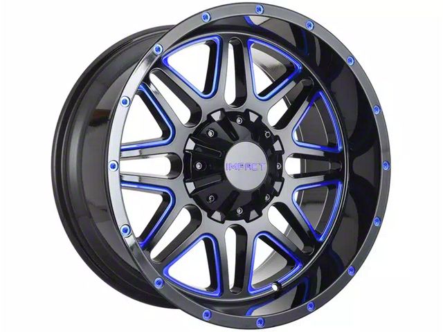 Impact Wheels 806 Gloss Black and Blue Milled 6-Lug Wheel; 20x10; -12mm Offset - This wheel's elegant design will certainly enhance your vehicle's aesthetic, complementing its luxury and performance. The unique styling of this wheel makes it an ideal choice for a standout quality of your ride, reflecting the premium quality associated with the Impact Wheels brand.