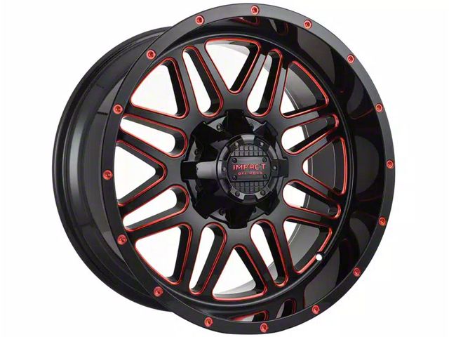 The 20x10 Impact Wheels 806 Gloss Black and Red Milled 6-Lug Wheel is completed in a high-quality gloss black finish with red milled accents. There's a durable clear coat that looks amazing and protects the wheel against the rigors of driving.