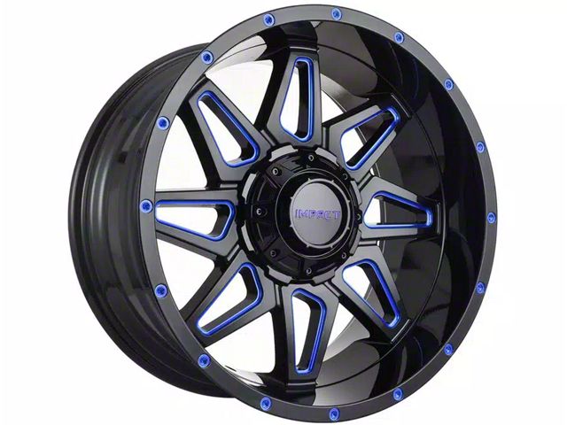 The 20x10 Impact Wheels 807 Gloss Black and Blue Milled 6-Lug Wheel is completed in a high-quality gloss black finish with blue milled accents. There's a durable clear coat that looks amazing and protects the wheel against the rigors of driving.