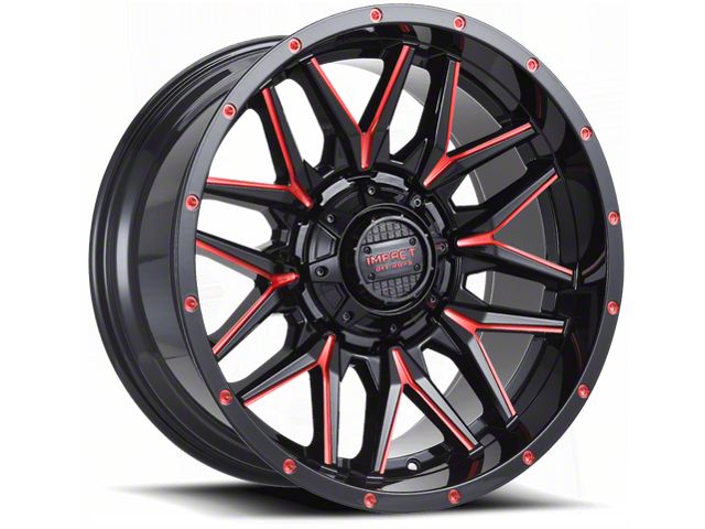 The 20x10 Impact Wheels 819 Gloss Black and Red Milled 6-Lug Wheel is completed in a high-quality gloss black finish with red milled accents. There's a durable clear coat that looks amazing and protects the wheel against the rigors of driving.