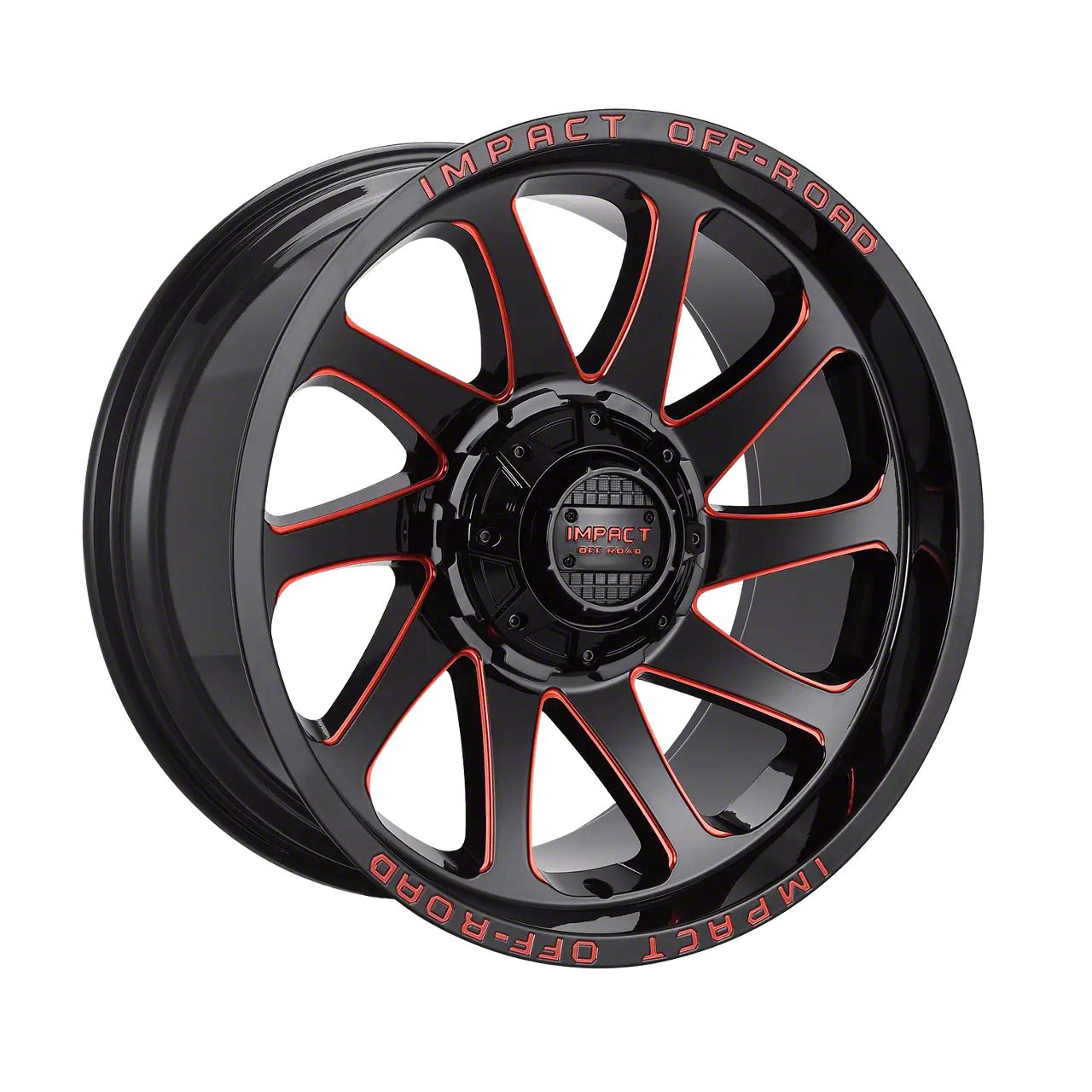 The 20x10 Impact Wheels 825 Gloss Black and Red Milled 6-Lug Wheel is completed in a high-quality gloss black finish with red milled accents. There's a durable clear coat that looks amazing and protects the wheel against the rigors of driving.