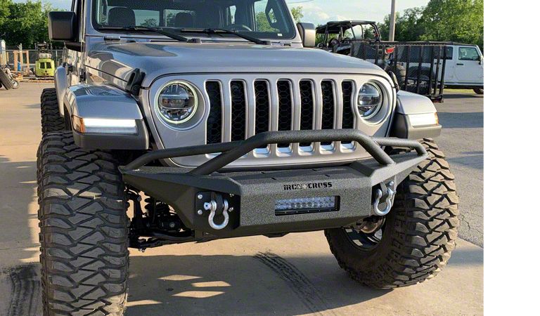 Application. This Matte Black Iron Cross Full Base Front Bumper with Bar is designed to fit 2018-2026 Jeep Wrangler JL models.