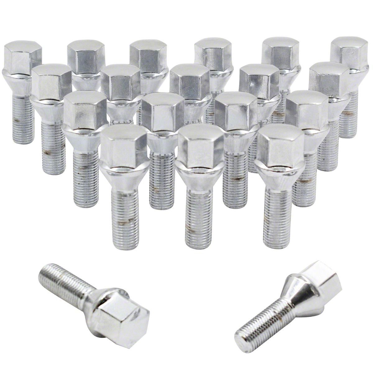 Construction and Appearance. Crafted with attention to both form and function, this lug bolt kit features a brilliant polished chrome finish that resists corrosion and enhances your vehicle's overall look. The high-quality material and manufacturing process ensure long-lasting strength, while the acorn seat design aids in accurate alignment and even pressure distribution across the wheel hub.