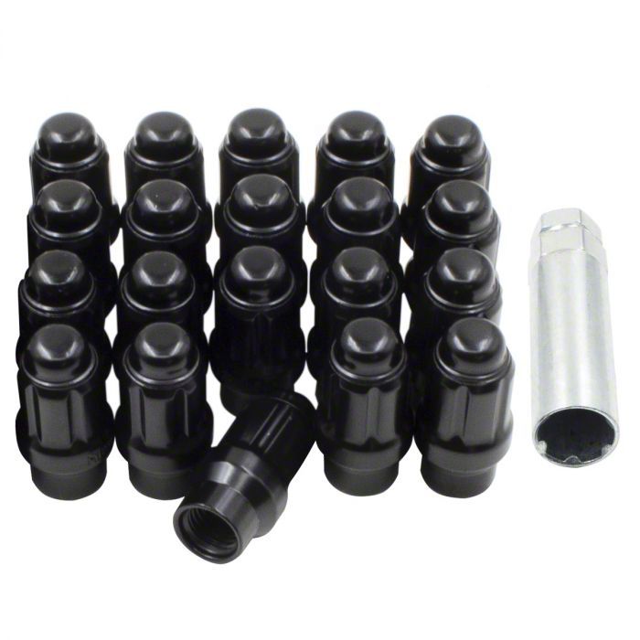 Stylish Wheel Security. Elevate the look and functionality of your ride with the Black Chrome ET Bulge Acorn Lug Nut Kit; 1/2-Inch x 20; Set of 20. Engineered for superior locking power, the ET bulge acorn design offers a wider seating surface area compared to standard lug nuts, enhancing the contact area between the lug nut and wheel. The striking black chrome finish not only adds a touch of elegance to your car 's wheels but also provides an extra layer of corrosion resistance, ensuring that your lug nuts remain in pristine condition, even in harsh weather conditions.