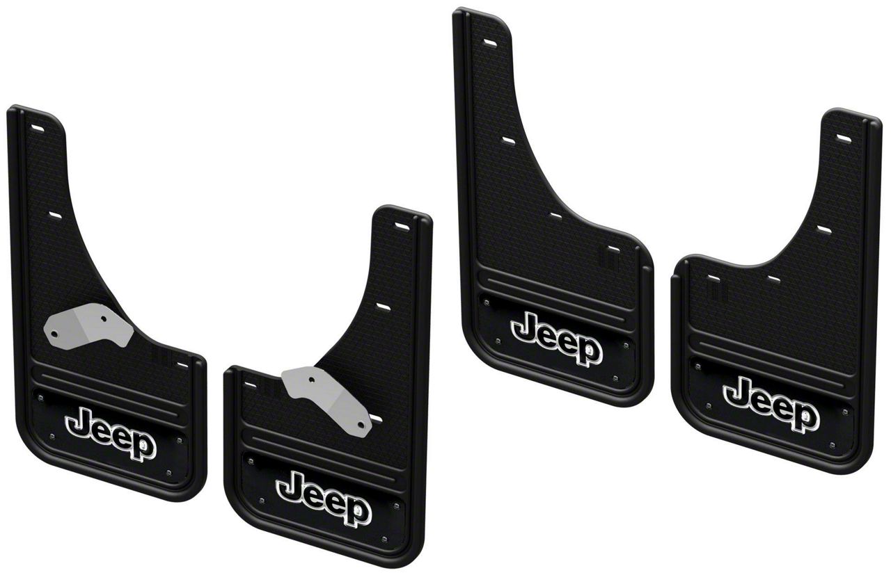 Black Wrap No-Drill Mud Flaps with Jeep Logo; Front and Rear (19-22 Jeep Cherokee KL Trailhawk)Find parts that fit my vehicle