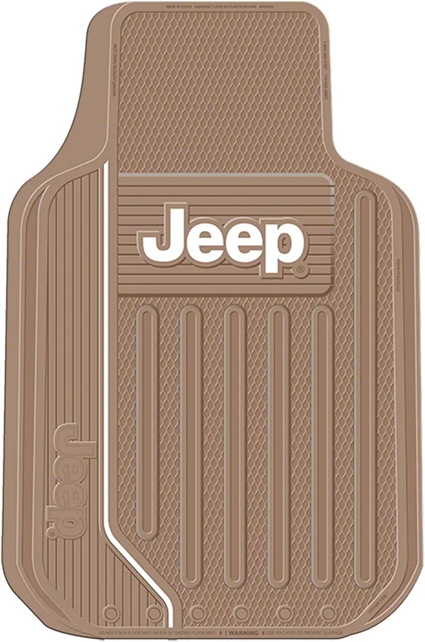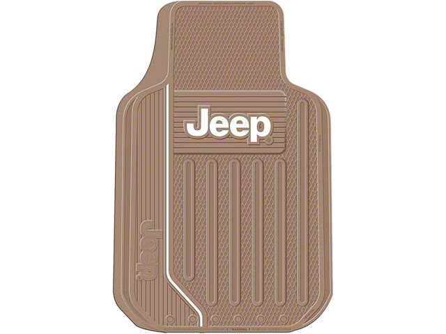 Front Carpet Protection. Don't waste time scrubbing and damaging your carpet and protect your vehicle's carpet with this Elite Series Front Floor Mats with Jeep Logo; Tan. Not only does it add a light modern color to your interior, but it also makes cleaning a breeze with its full front seat coverage. It features high walls and deep treads to boost traction and padding for your feet and catch spills and messes instead of having debris stain your precious carpet. It is easy to hose down, clean and ready for the next drive.