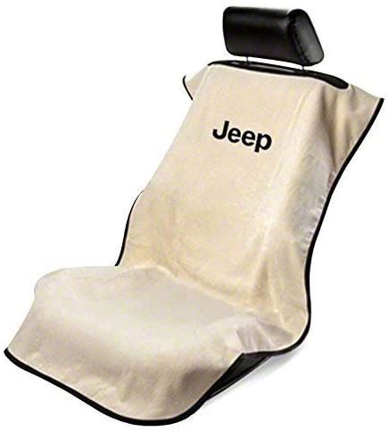 Wear-Resistant Construction. Made for your adventurous lifestyle, this Seat Cover with Jeep Logo is crafted from high-grade, 100% cotton terry/velour. This material withstands the mess and provides all-around protection. In addition, it comes in a stylishly elegant tan fabric with a black Jeep logo that adds a combination of a sophisticated and rugged look.